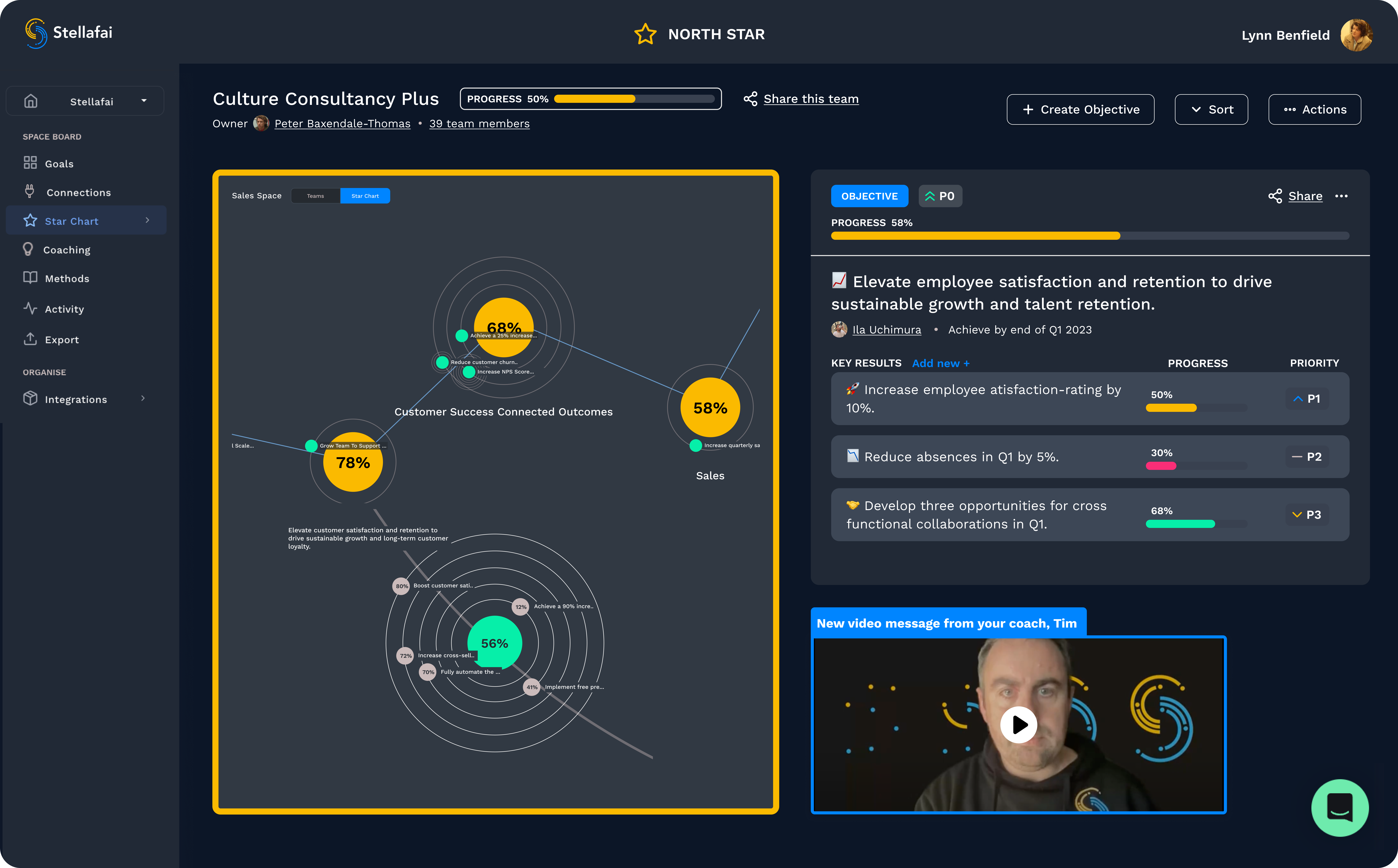 Stellafai gives your consultancy a branded client workspace with everything needed to run evidence-led engagements: goals and measurable signals to track what matters, a living history of decisions and progress so nothing needs re-explaining, a Star Chart to visualise dependencies across teams, a method library to productise your IP into reusable templates, and insights that show what's working across all your clients. Add lightweight check-in cadences, asynchronous coaching, on-demand booking, and ROI dashboards your clients can share with their CFO and you have a complete delivery operating system that makes your impact visible, your partnerships stickier, and your renewals inevitable.