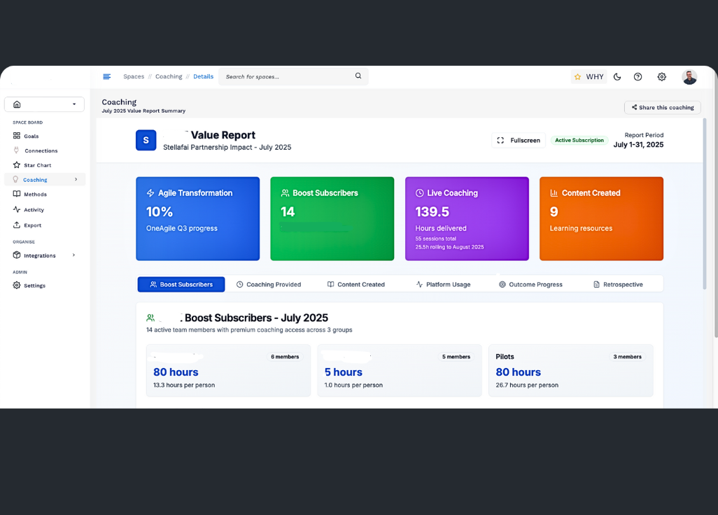 When you start an engagement in Stellafai, you and your client define clear outcomes together. Not vague goals like "improve efficiency," but specific, measurable targets. When you set these up in your Stellafai space, both you and your client can glance at this dashboard and know exactly where things stand.